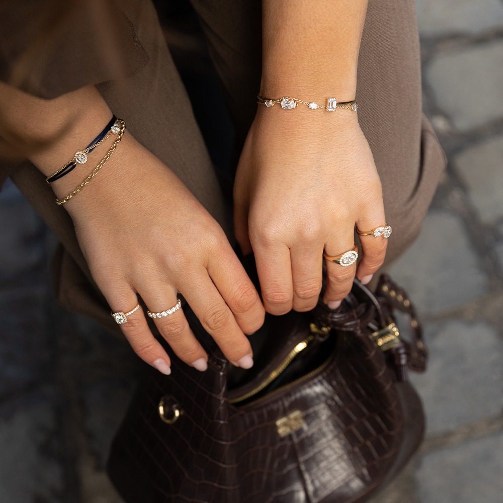 De combinatie van de twee verschillende slijpvormen geeft de armband een speels en opvallend effect. Door het open spang ontwerp komen de diamanten mooi naar voren en krijgt de armband een moderne en krachtige uitstraling.