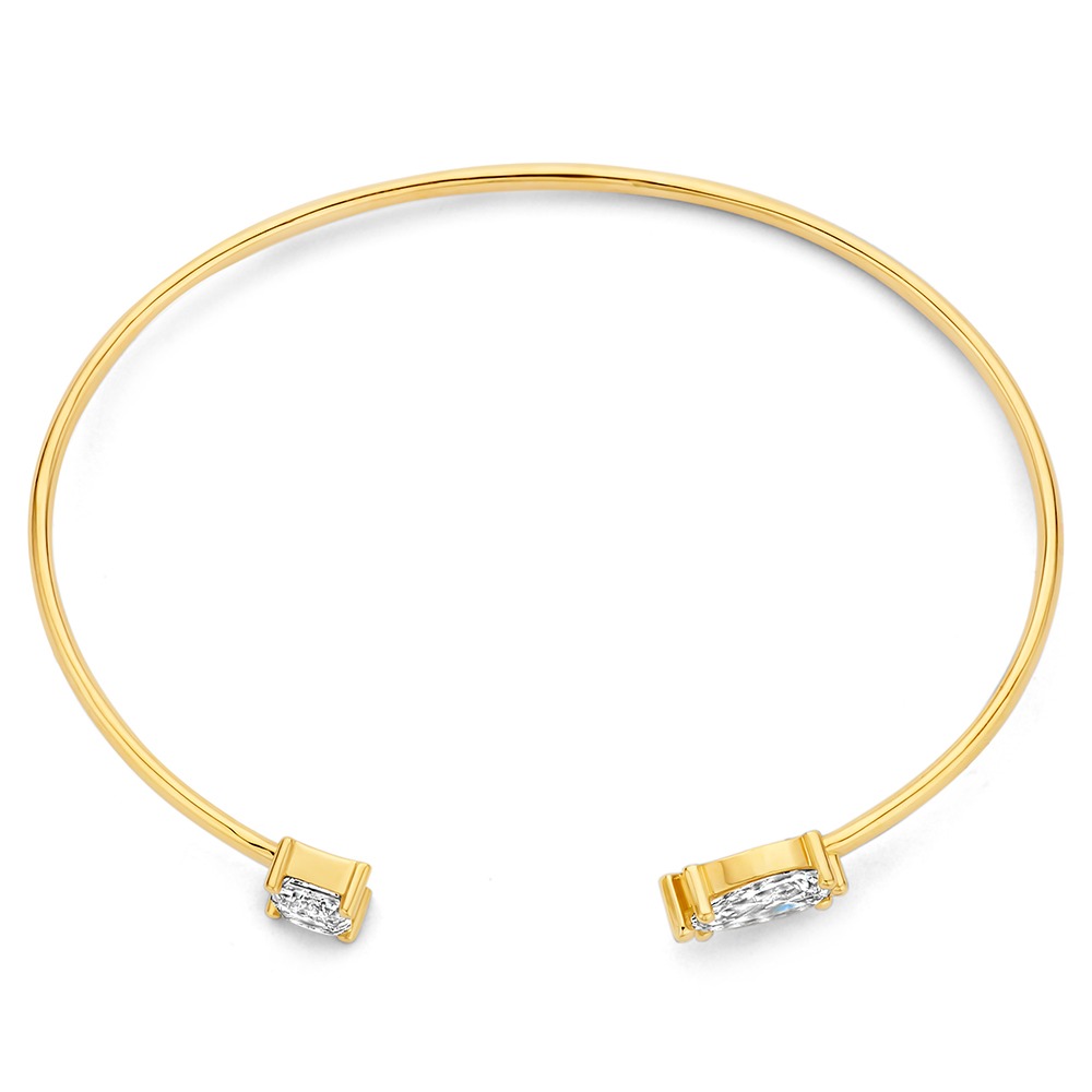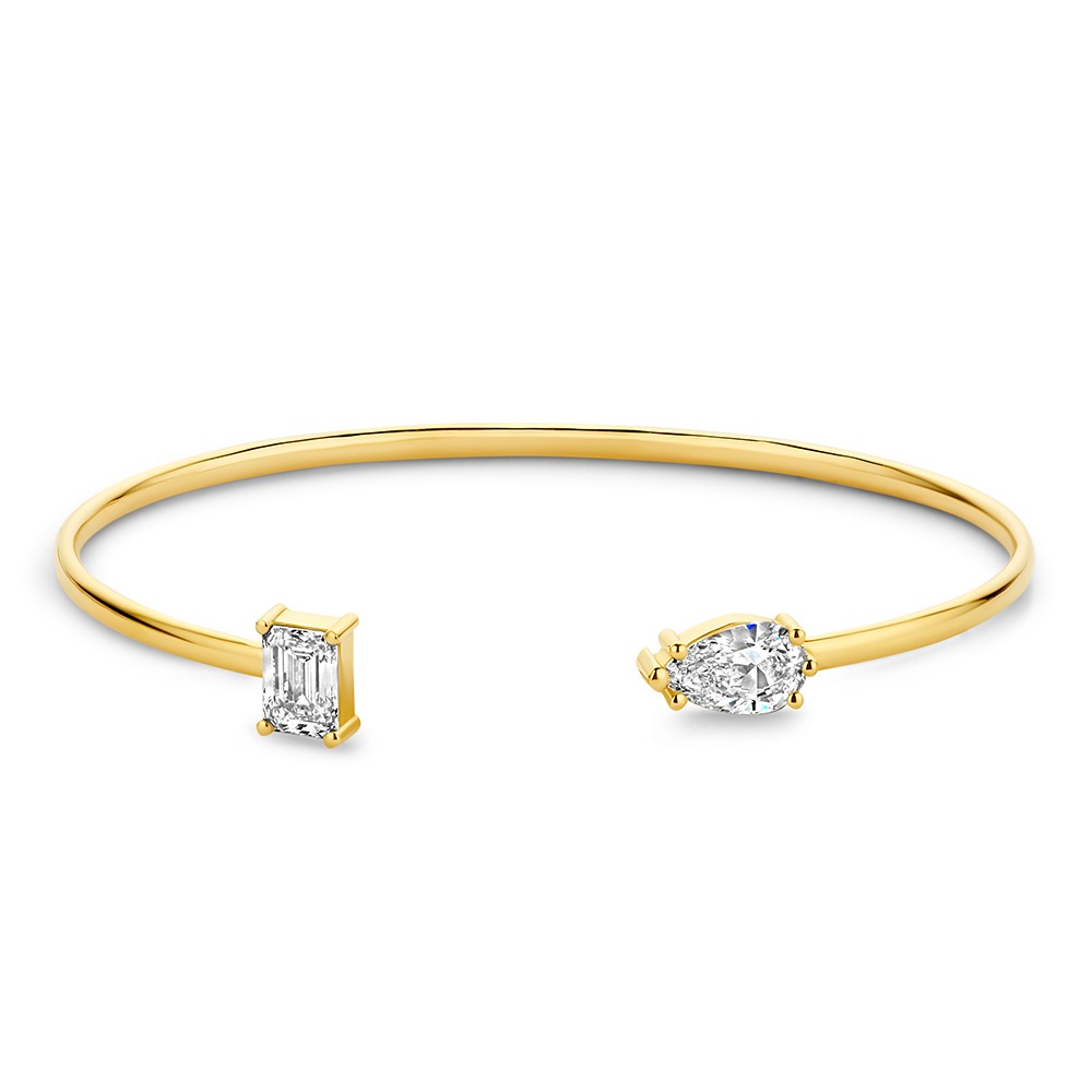 Een massieve spang armband van 14 karaats goud met twee diamanten aan de uiteinden. Aan de ene kant staat een peervormige lab grown diamant van 1.00 ct en aan de andere kant een emerald cut lab grown diamant van 1.00 ct.
