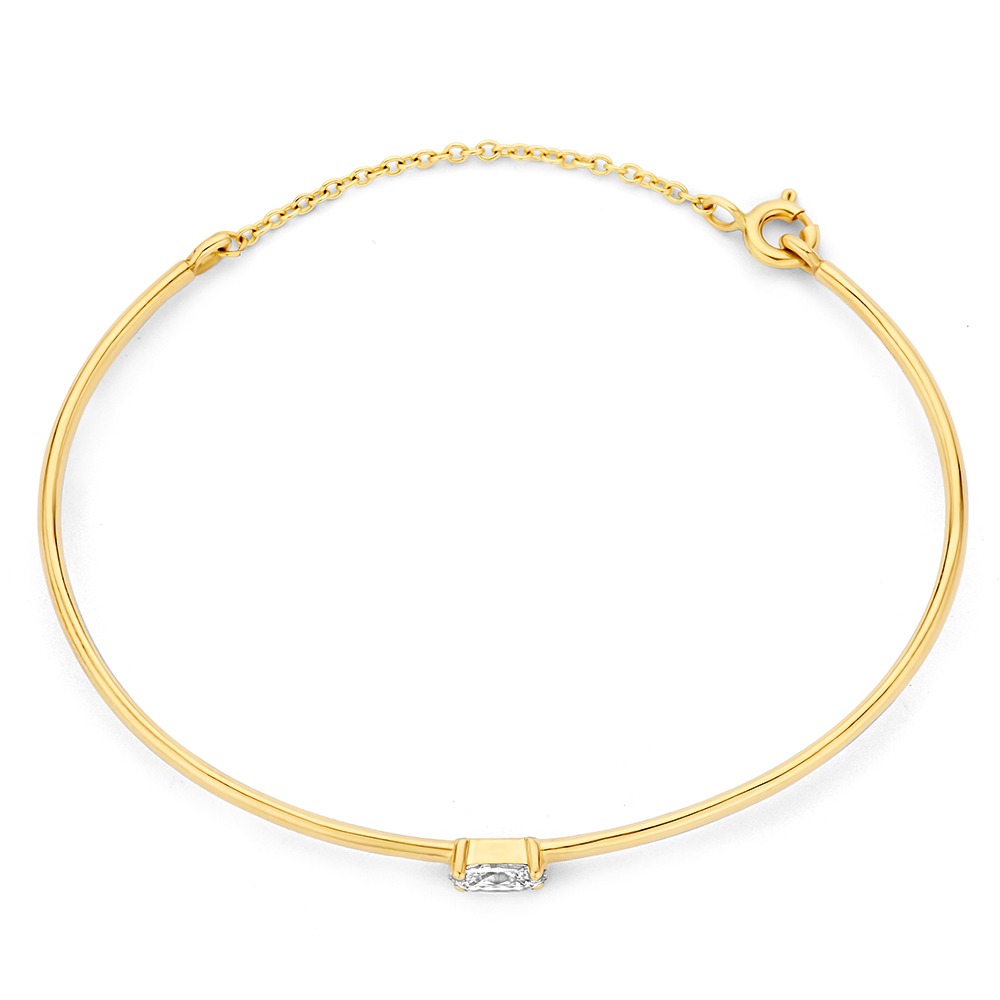 Een massieve spang armband van 14 karaats goud met een subtiele sluiting. In het midden is een ovale lab grown diamant van 0.50 ct geplaatst, die mooi op de armband rust.