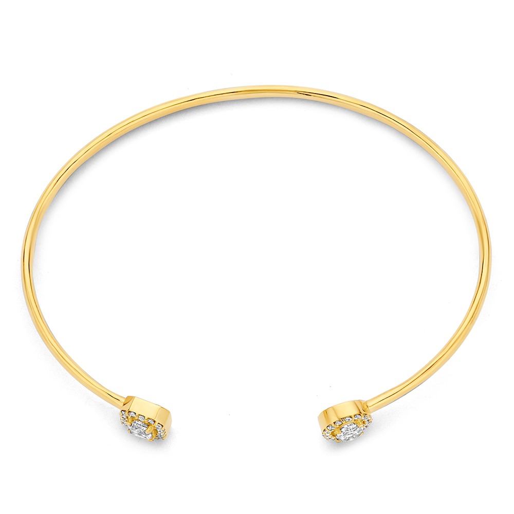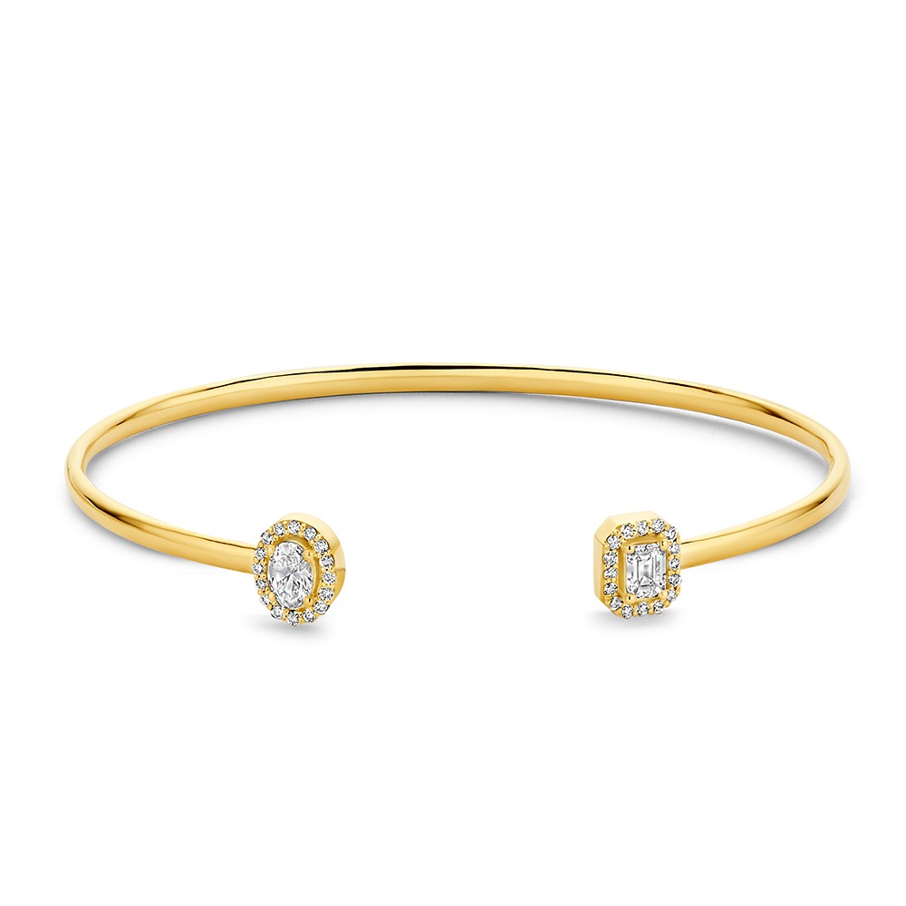 Een massieve spang armband van 14 karaats goud met twee halo zettingen aan de uiteinden. De armband is bezet met een ovale en een emerald cut lab grown diamant van elk 0.25 ct, beide omringd door een halo van kleine briljant geslepen diamanten.