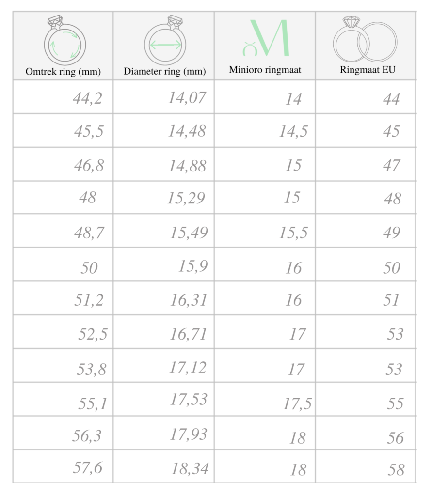 - Gebruik de tabel hiernaast voor het aflezen van je ringmaat.